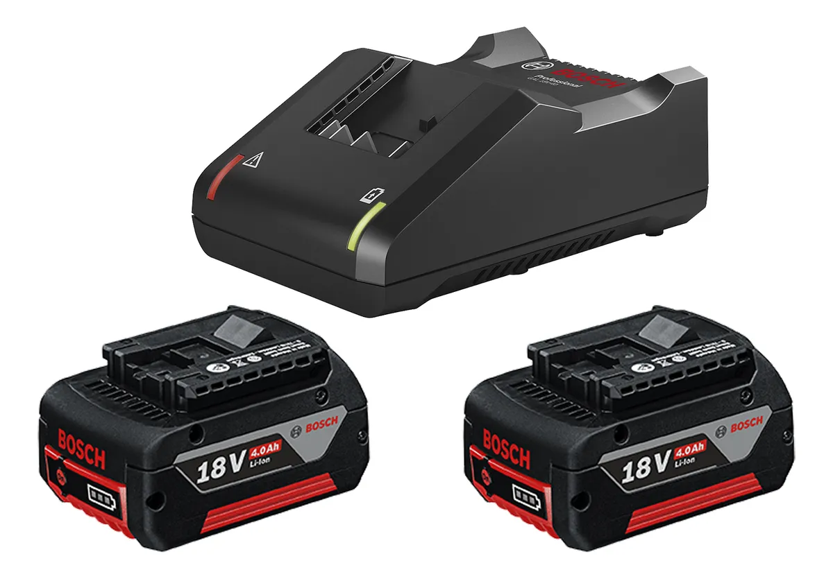 Este kit de Bosch esta compuesto por 2 baterías GBA 18V 4,0 Ah de iones de litio de 18V con autonomía de 4,0Ah y un cargador rápido de 127V GAL 18V-40, juntos proporcionan un gran desempeño en las aplicaciones que exigen máxima corriente y mayor tiempo de uso. Las baterías GBA 18V 4.0 Ah cuentan con celdas de iones de litio, que no provocan efecto memoria y no se descargan en reposo. Proporcionan un largo tiempo de uso con la misma carga, aportando más autonomía al trabajo. Además, tienen un exclusivo sistema de temperatura Coolpack, que mantiene fresco el interior de la batería, aumentando su vida útil. Son fabricadas con materiales flexibles, ideal para absorber el impacto en caso de caída. El cargador de baterías rápido Bosch GAL 18V-40, tiene un voltaje de 127V y es compatible con el 100% de baterías de 18V de Bosch, ofrece un trabajo continuo más eficiente con corriente de salida de 4Ah. Tiene LED indicador de carga completa, así como indicación de falla y sobrecalentamiento. La longitud del cable es de 1,5 metros que permite mayor alcance a la hora de realizar el trabajo. Con este cargador rápido la batería de 4,0 Ah se carga al 80% en 48 min y al 100% en 65 min. El kit viene con 2 baterías GBA 18V 4,0 Ah, 1 cargador GAL 18V-40 de 127V, 1 manual de instrucciones del cargador y 1 manual de instrucciones de la batería