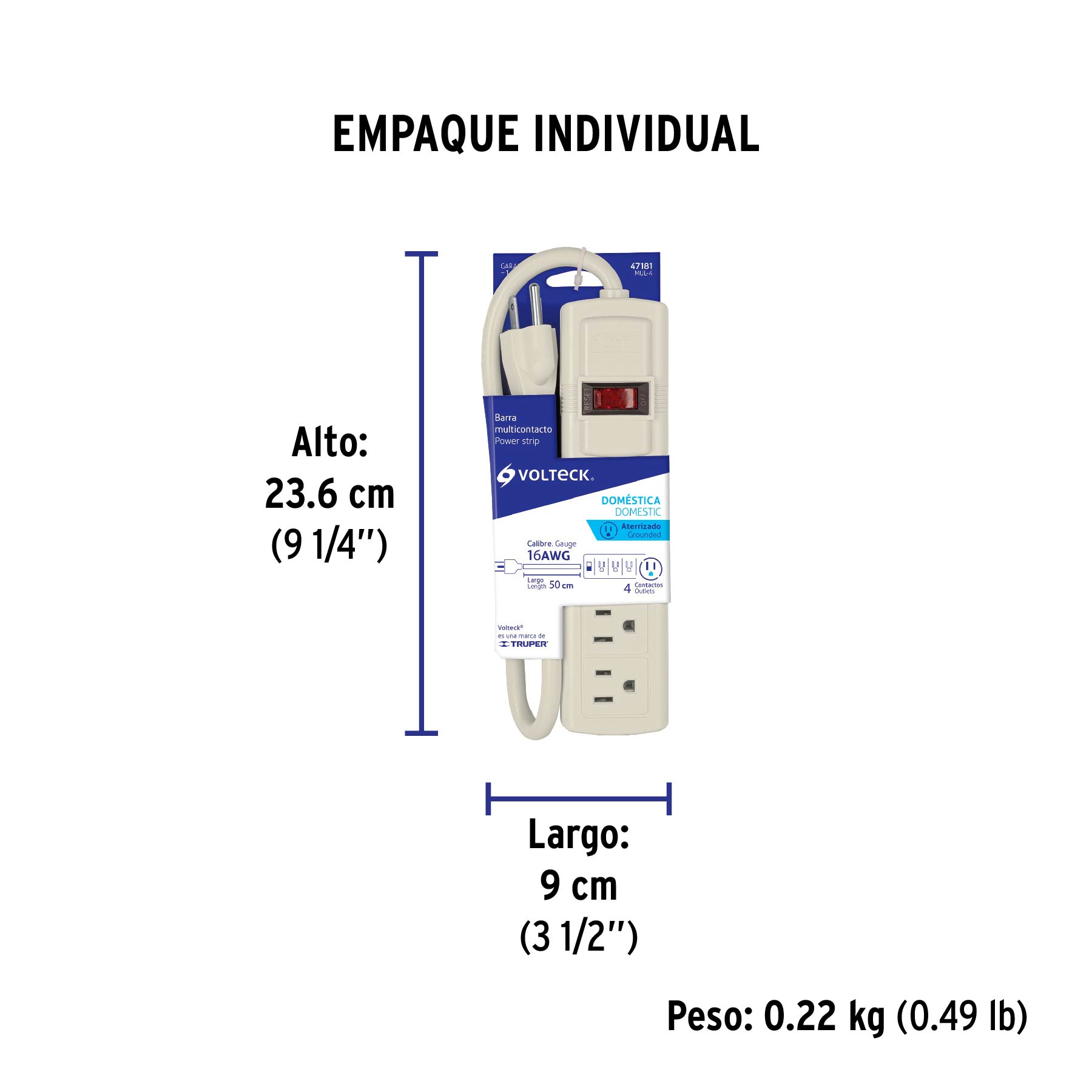 Número de contactos 4 Calibre 16 AWG Tensión / Frecuencia 125 V / 60 Hz Corriente 13 A Potencia 1 625 W Largo del cable 50 cm